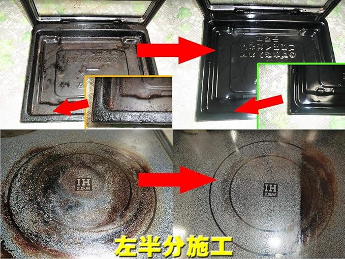 キッチンや厨房にある【炭化した油汚れ(焦げ)】をどのように洗浄していますか? 研磨剤や金たわし・ケレンいったもので擦ると傷が付くだけでなく焦げや汚れが再付着しやすくなってしまいます。劇物や有機溶剤に付けておくと満足に取れないだけでなく塗装を剥がしたり素材そのものを痛めてしまう恐れがあります。 【こげとりぱっとビカ】は簡単に【焦げ付き】を落とす事が出来る毒物劇物取締法及び有機溶剤中毒予防規則に非該当な洗浄剤です。また研磨剤を含んでいないので光沢を落とす心配がありません。 ※アルミ製品・樹脂加工品には使用出来ません。 ※作業時間:1~6時間程度、固着している場合は24時間程度ラップ等で乾かないようにシップして下さい。その後洗浄剤のハネ、飛び散りに注意してナイロンブラシまたはプラスチック製のヘラでこすり落としてください。