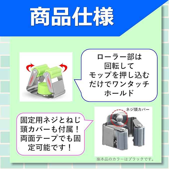 【 ️幅広いサイズに対応&しっかりホールド ️】 様々なモップやほうきの柄に対応。ゴム製のグリップがしっかりと固定し、滑り落ちる心配がありません。収納したい掃除道具のサイズを選ばず、さまざまなアイテムに対応可能です。