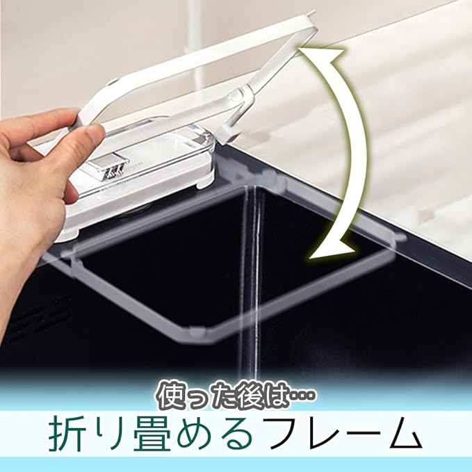 シンク脇に吸盤を貼り付けてレバーを下ろすと真空状態になりピタッと吸着します。フレームの接着面は吸盤式により何度でも貼り直し可能です。未使用時はフレームを折り畳むと布巾掛けとしてもご使用いただけます。