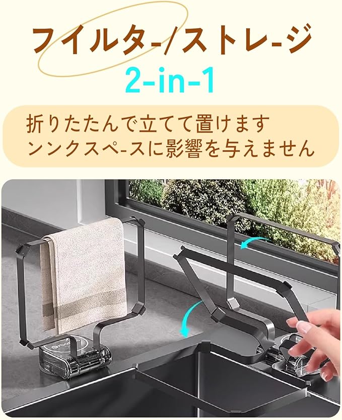 【スペース節約】:コンパクトでスリムなデザインにより、キッチンのスペースを有効に活用できます。シンクの縁や内壁に簡単に取り付けられるため、作業スペースを広く保つことができます。