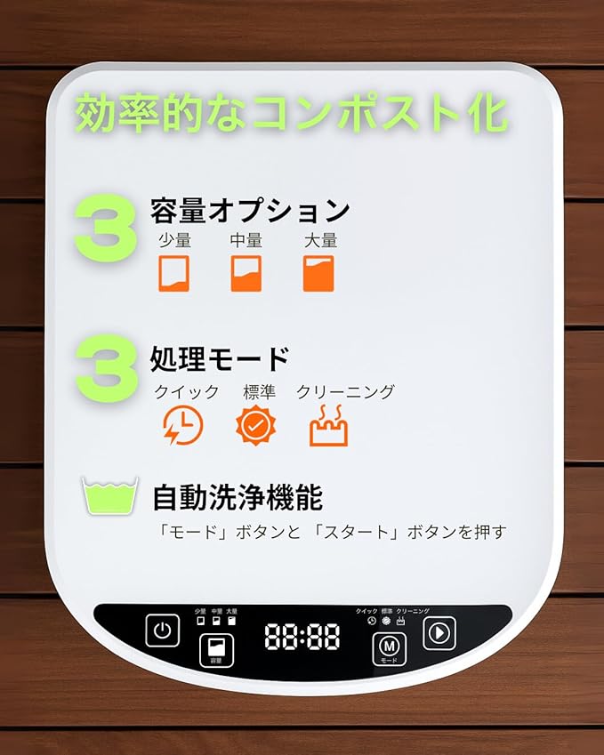 【80%生ごみ削減処理】:aGratHav生ごみ処理機は、たった3.5時間で生ごみを80%削減。高温乾燥・粉砕・冷却処理により、野菜くず、果物くずだけでなく、肉類と魚類も処理できます。忙しいキッチンでも素早く効果的な堆肥化を実現。より緑豊かで清潔な地球づくりに貢献しましょう。