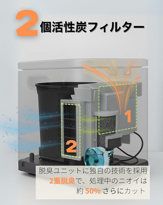 【活性炭フィルター2個と自動洗浄機能】 2個取り替え可能なフィルター付き。活性炭の力で脱臭&除湿し、強力脱臭システム搭載、イヤな臭いがほとんどしない。自動洗浄より、処理機の内部はいつも清潔に。