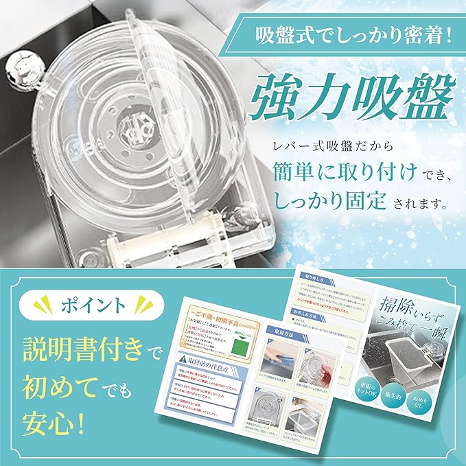 【強力吸盤】 「ズレる・落ちる」が心配な方も安心。強力吸盤がシンクにしっかり密着し、抜群の安定感でしっかり固定。外れにくいのに、レバーを回すだけで簡単に取り外し可能。毎日使うからこそ、ストレスフリーな固定力にこだわりました。