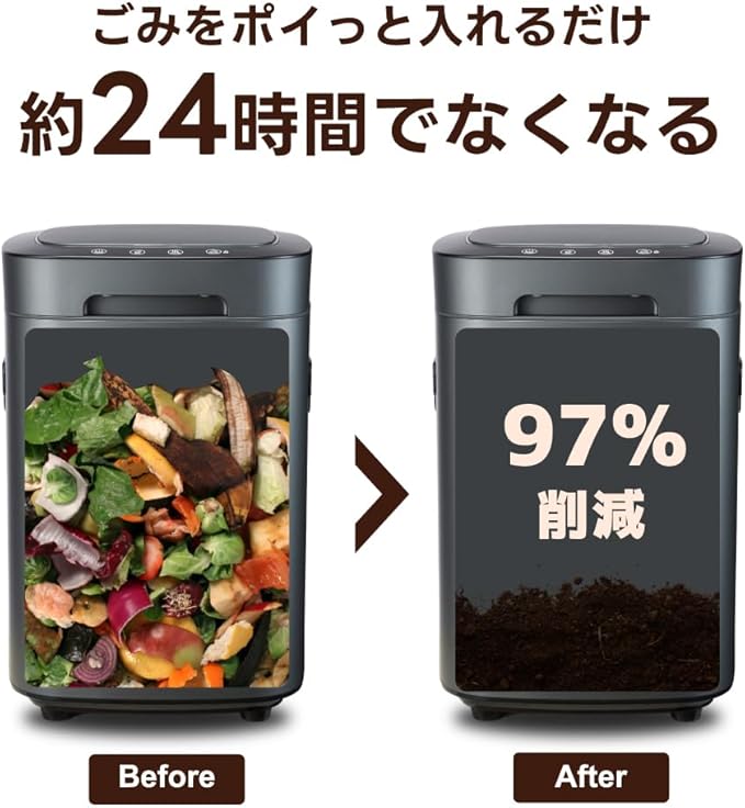 ✓【省エネ設定】消費電力は52W。一般的な乾燥式の生ごみ処理機の1/3、バイオ式の1/2の消費電力を実現しました。熱を加えて乾燥処理を行う乾燥式に比べ、熱とバイオの力で処理を行うための家計にも優しい省エネ仕様に設計されています。