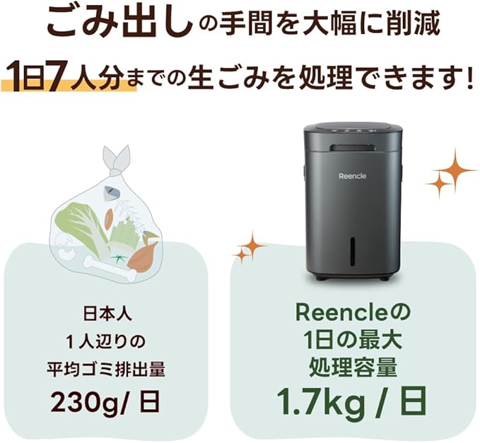 ✓【25db以下の消音設計】冷蔵庫よりも静かな処理音を実現いたしました。乾燥式の生ごみ処理機は熱を加えて処理を行うため、処理中のモーター音が発生いたします。しかし、Reencleの生ごみ処理機はハイブリッド式で内部の攪拌がゆっくりと回転しバイオの力で処理を行うため、処理音を最小限に抑えることができます。