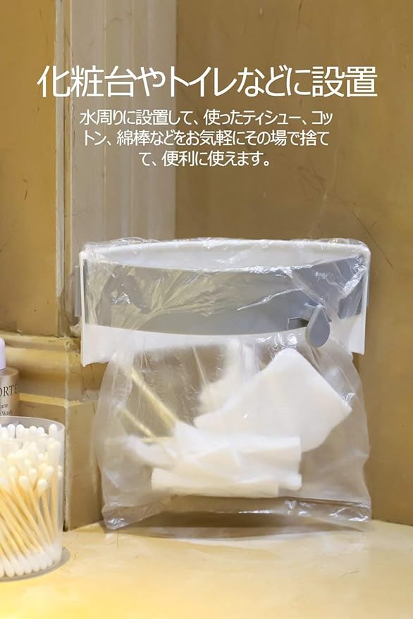 【省スペース】ポリ袋を引っ掛けるだけで簡易ゴミ箱に~狭いシンクでも邪魔にならず、調理中にでる野菜クズなどをその場でポイ。シンクを広~く使え、ぬめりも減りました。また化粧台やトイレに設置して、使ったティシュー、コットン、綿棒などをお気軽に捨てられます。女性の方に特にオススメ。