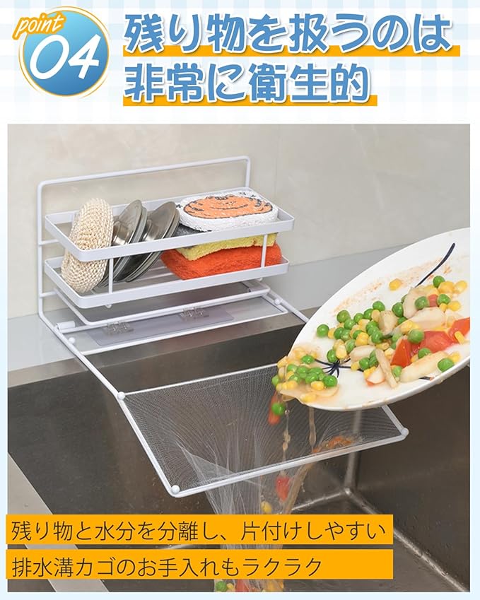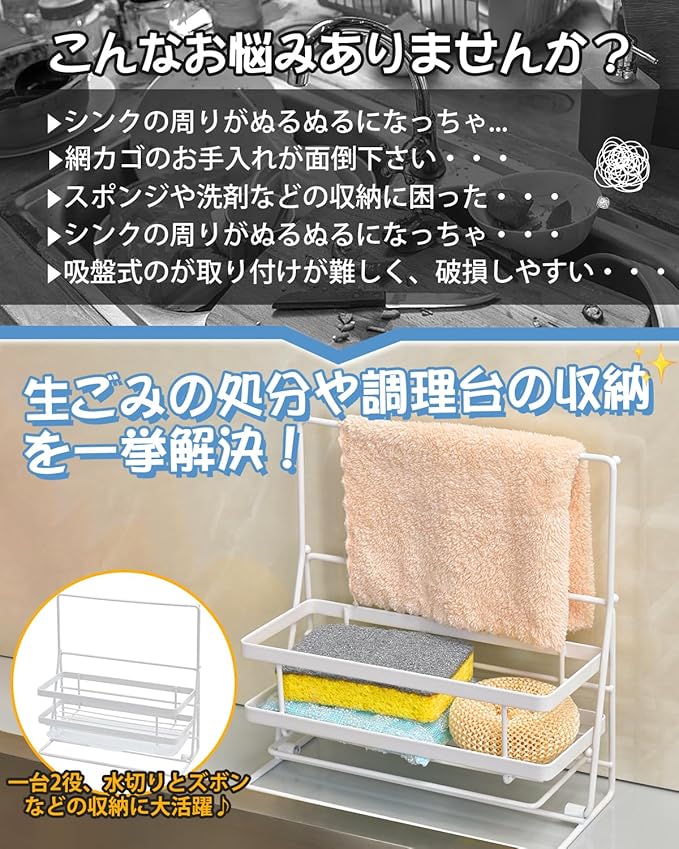【一台二役の水切りネットホルダー】市販の水切りネットホルダー、サンカクコーナーにより使い勝手が良いシンク 水切りです。 生ゴミの水切りやスポンジなどの収納機能を備えており、狭いキッチンでもスペースを最大限に活用できます。 キッチン収納、流し台をキレイに、生ゴミの水切りに困った方に必見です。