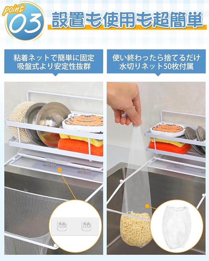 【説明書付きで設置簡単】シンク上に置くだけ使用できる水切りネットホルダーなので、吸盤が弱く、潰れるなどの心配はありません。 付属の粘着フックで固定するだけで使用可能で、女性でも上手く取付ます。 流し台と壁に固定する2つ設置方法があるので、ほとんどのキッチンに対応できます。 詳しい日本語説明書も同梱しておりますので、だれでもスムーズにご使用いただけます。