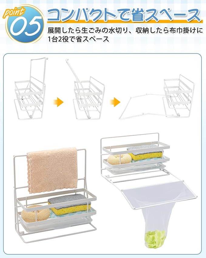【折りたたみ式で省スペース】水切りラックはスポンジホルダーとして活用し、スポンジや他の食器洗い用品を収納するだけでなく、トレーを装備しているため、使用後の排水がラクラク。 ネットホルダーは折りたたみ式なので、使わない時立てて収納、雑巾干しとして使用、流し台のスペースを活用し、作業スペースを広く保つことができます。 従来品により便利でありながらお得です。