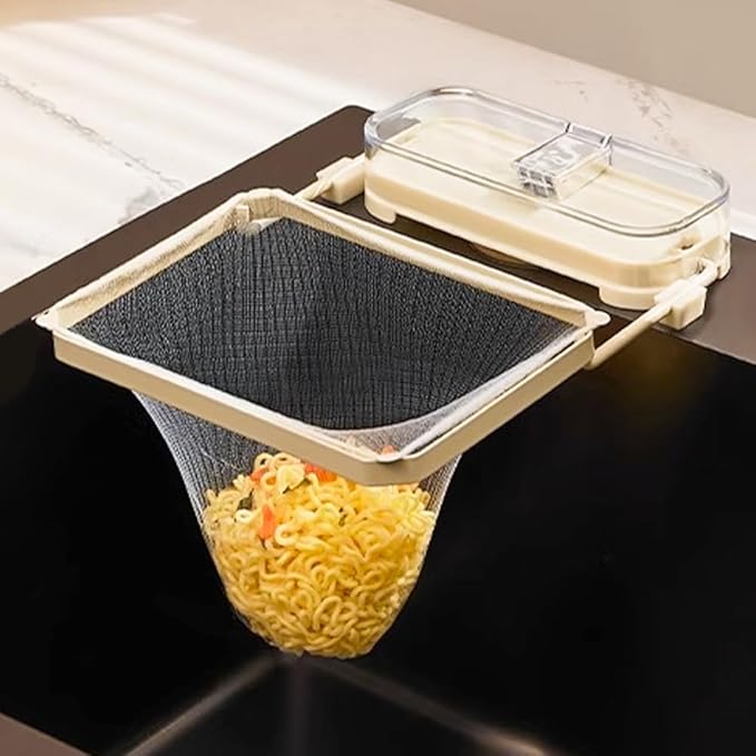 シンクの縁に粘着パッドで貼るだけで設置できる生ゴミネットラックです。シンク内に三角コーナーを置くと作業空間が手狭になる、カビやヌメりが気になる…といったお悩みを解決します。