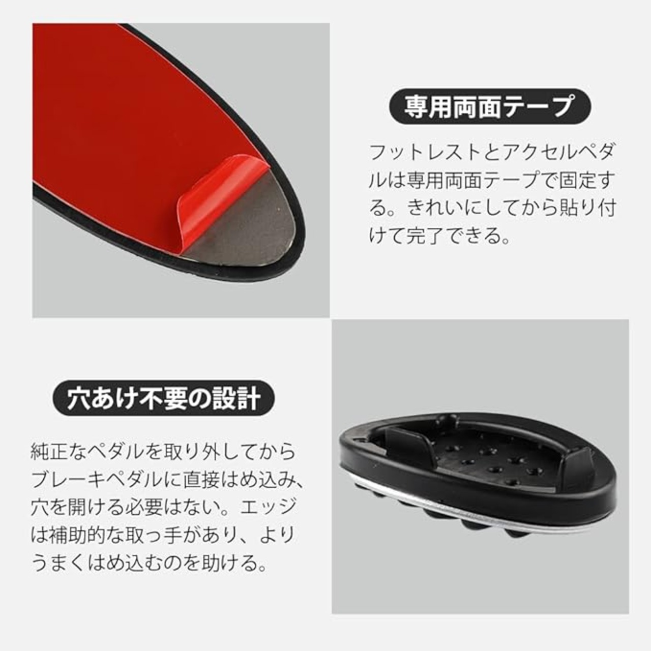 <超かんたん装着>説明書が付き、工具不要で一瞬で装着できます。素人でも操作可能です。アクセルペダルは純正ペダルの上からスライドして装着、ブレーキペダルは純正なゴムカバーを外してから取り付け、左足を置くプレートは両面テープで貼りつける方法です。