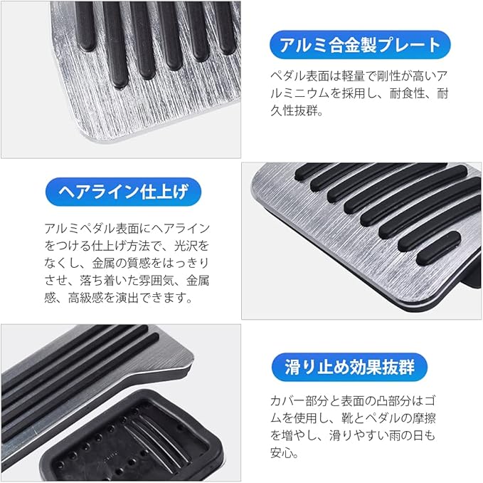 優れた素材:ペダル表面は軽量で剛性が高いアルミニウムを採用し、カバー部分と表面の凸部分はゴムを使用し、靴とペダルの摩擦を増やし、滑りやすい雨の日も安心。ドライブの安全性を向上する一方、足元の質感もアップします。