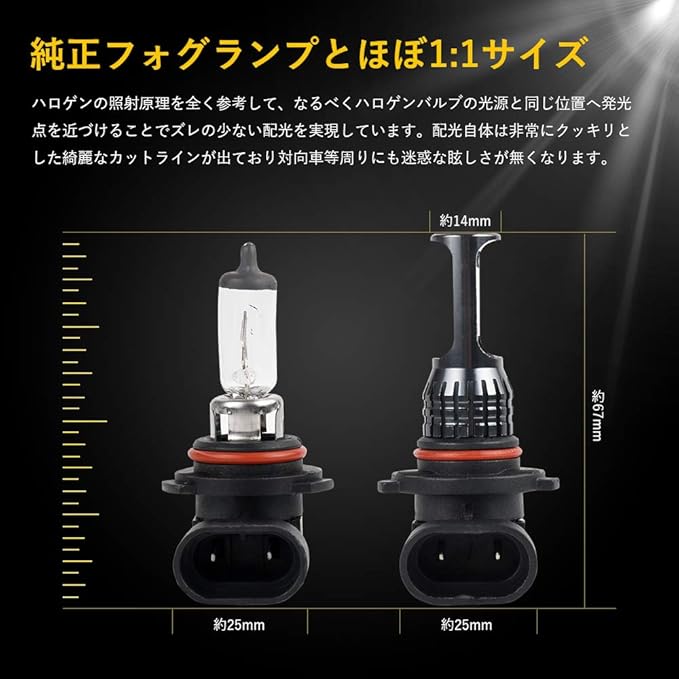 【完璧な配光】ハロゲンの照射原理を全く参考して、なるべくハロゲンバルブの光源と同じ位置へ発光点を近づけることでズレの少ない配光を実現しています。配光自体は非常にクッキリとした綺麗なカットラインが出ており対向車等周りにも迷惑な眩しさが無くなります。