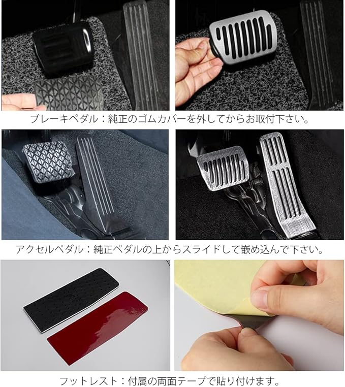 取り付け方法:説明書付き、工具不要でワンタッチで取り付け可能。アクセルペダルは純正ペダルの上からスライドして嵌め込んで、ブレーキペダルは既存のゴムペダルを取り外して付け替え、フットレストは両面テープで貼り付けます。