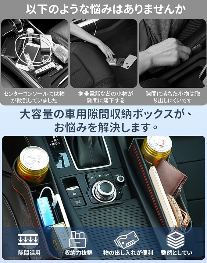 【2個セット&大容量収納】 運転席用と助手席用の2個セットです 。仕切り機能で小物を分類整理でき 、カップホルダー・スマートフォン ・ヘッドフォン ・サングラス ・財布 ・鍵 ・カード など、さまざまなアイテムを収納可能。車内がすっきり片付き、収納場所に困っている方、シート間に物を落としがちな方に特におすすめです 。