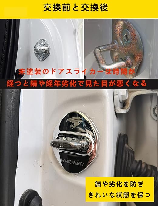 トヨタに適用 ハリアー専用設計、ドアストライカーに装着するドレスアップパーツです。適用機種:ハリアー60系 80系専用設計 ZSU60 ASU60 AVU65 AVU60 MXUA80 MXUA85 ドア ストライカー カバー 車用ドアロック