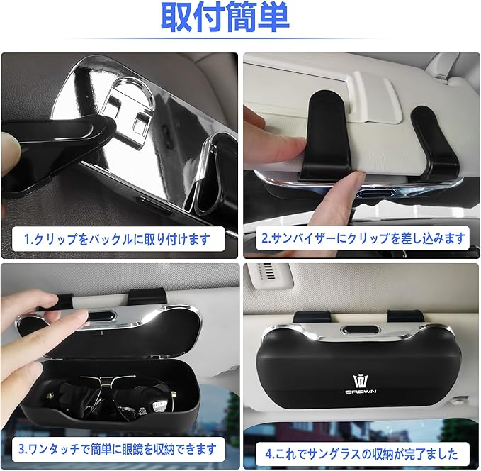 【ワンタッチ操作】スナップオン設計を採用しております。ボタンを押すだけで自動的に開き、片手で眼鏡を取り出すことができます。運転中に衝撃でケースが開く心配もなく、安全に使用できます。取り付けは簡単で、工具不要のフック式でサンバイザーに挟むだけで設置でき、女性でもラクに取り付け可能です。