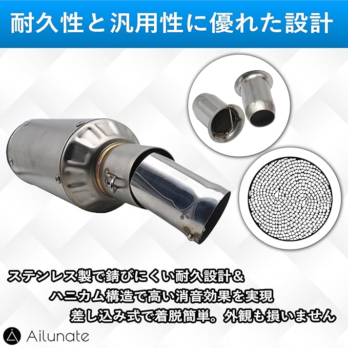 【優れた消音効果】ハニカム構造により排気音量を効果的に抑制し、快適なライディング環境を実現します。近隣トラブルも防止できるバイク用インナーサイレンサーです。