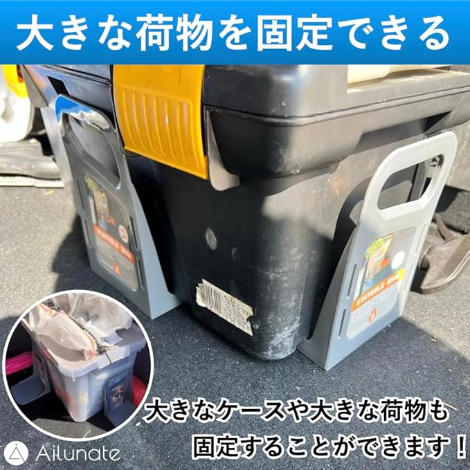 ✅【大きな荷物を固定できる】ブックスタンド型の形状になっており、荷物を挟み込むことで工具箱や収納コンテナなど大きなケースや大きな荷物を固定できます。