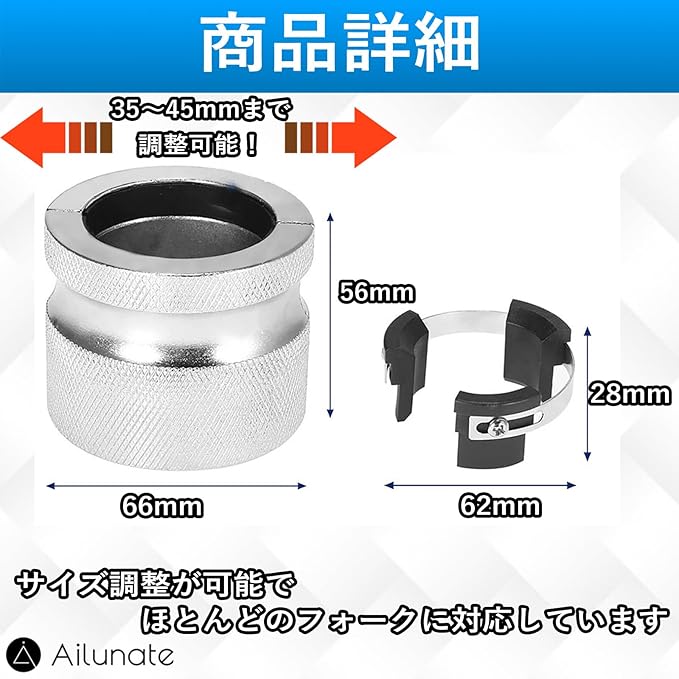 【幅広い対応】35mm〜45mmのサイズに対応し、ほとんどの正立・倒立フォークで使用可能です。高い互換性が魅力です。