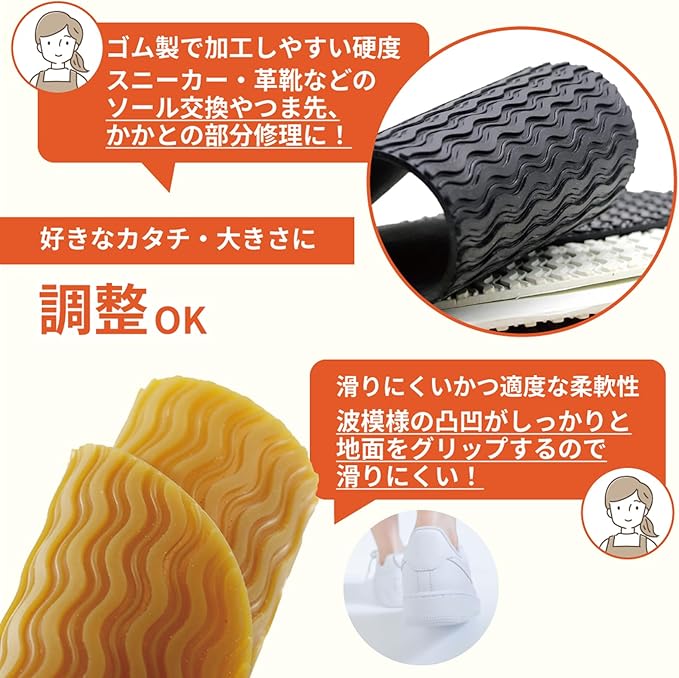 お好みの大きさ・形状にカットできるので、革靴・スニーカーなどさまざまな靴のソール交換やつま先・かかとなどの部分補修に便利。