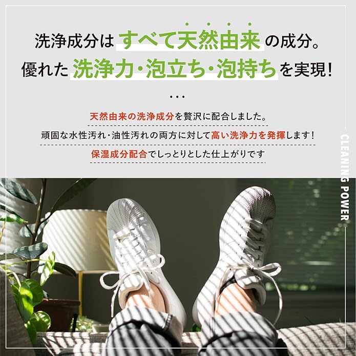 洗浄成分はすべて天然由来の成分/優れた洗浄力・泡立ち・泡持ちを実現 天然由来の洗浄成分をリッチに配合しスニーカーに優しく、水性汚れ・油性汚れの両方に対して高い洗浄力を発揮します。