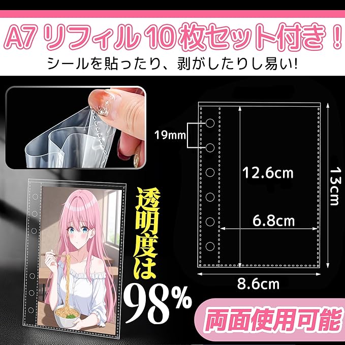 【高透明3層フィルムで美しく整理】A7サイズのシールバインダーに最適な、8.6cm 13cmの透明シール台紙を10枚セットご用意。3層構造の特殊フィルムが立体シールやカード、写真をしっかり固定。ほこりや汚れから大切なコレクションを保護し、美しく整理できます。はがせる設計でレイアウト自由自在。6穴仕様のクリアバインダーとして、女の子に人気の可愛いシール収納に最適です。