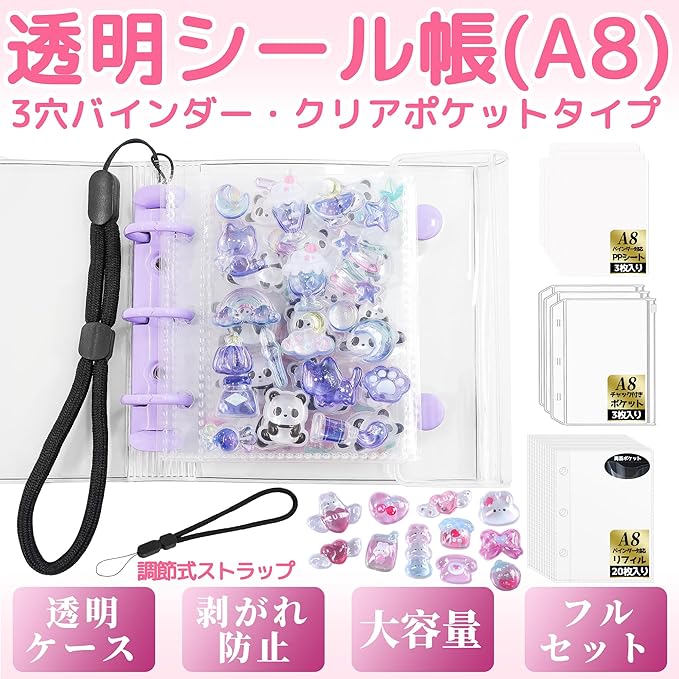 【多彩な使い方ができるマルチユース】A8サイズの3穴タイプのシールバインダーは、はがせるPPシートを使ったシール収納だけでなく、日記帳やスケジュール帳、旅行の思い出アルバムとしても活用できます。透明なクリアカバーは自由なデコレーションが可能で、女の子のかわいいミニシール帳として、世界に一つだけのオリジナルシール手帳を作成できます。