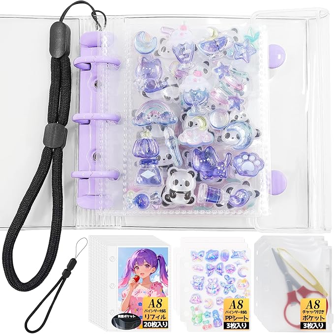 シール帳 透明 A8サイズ ミニ バインダー 【リフィル 20枚 チャック付きボケット 3枚 PPシート 3枚 専用ストラップ付き】プラバン 両面カードポケット シール台紙 手帳 プリ帳 カードスリーブ 透明シール帳 推し活グッズ はがせる バインダー型ノート 女の子 コラージュノート 色:パープル | etshop
