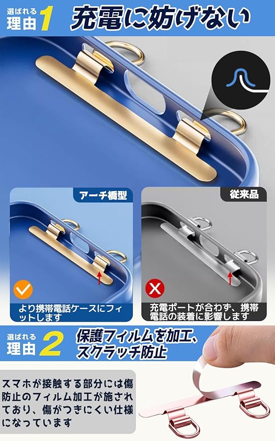 【2 ポートタイプ、充電に全く影響なし】 従来のスマホリングやスマホホルダーは、充電口に干渉しやすい欠点がありましたが、本製品は2つの掛けリングを搭載したスマホストラップホルダーです。曲がれ設計で浮きにくい。ケースのスピーカー口に通すことで、充電やイヤホンの接続を完全に妨げることなく、ストレスフリーでスマホを使えます。頑丈なステンレス製の金具を使用しており、可愛いデザインのストラップやストラップホールが揃い、日常生活やランニング時にも安心して使用できます。