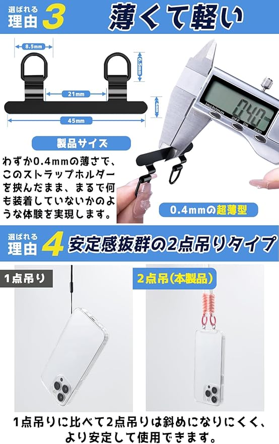 【0.4mmの超薄型&保護フィルムを加工】 このストラップホルダーは、超薄型デザインを採用しており、スマートフォンにぴったりフィットします。金属製のスマホリングやスマホホルダーと組み合わせて使用することで、スマホを傷から守ります。接触面にはスクラッチ防止フィルムが施されており、傷が付きにくい構造になっています。携帯ストラップやショルダーストラップ、ネックストラップと連携し、すぐに直接使用可能です。携帯電話のサイズに合わせて設計されているので、ショルダーバッグやポケットにも収まりやすいです。