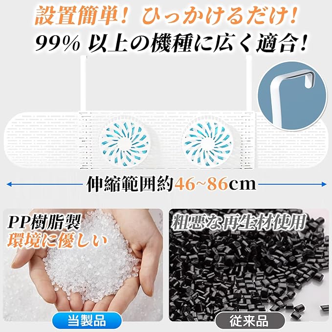 【46-86cm伸縮で簡単設置】伸縮自在フレーム(46~86cm)が国内主要HOTの壁掛けエアコン99%に対応。強化pp樹脂採用で3kgまで耐荷重。工具不要の3ステップ取り付けで賃貸住宅でも安心。