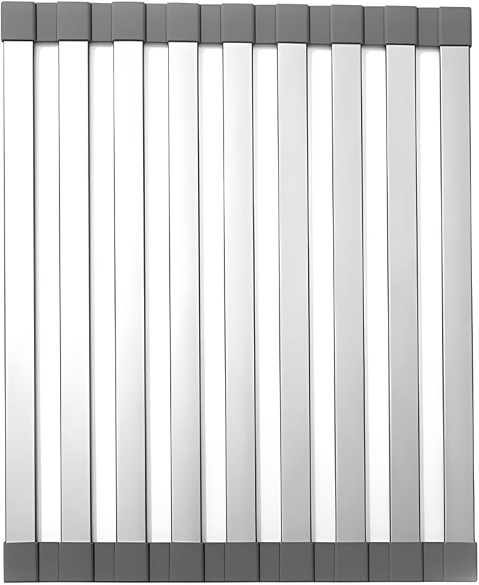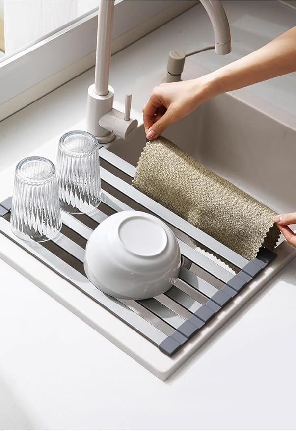 シンクの上に広げるだけでカンタンに設置できる水切りラック。両サイドのシリコンキャップがシンクにしっかりとくっつき、ズレ落ちの心配がありません。