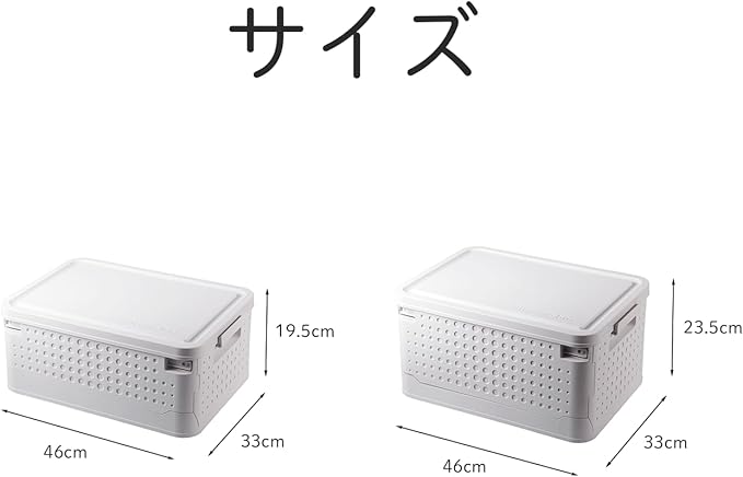 2サイズ・軽量設計 – 高タイプ:横46 奥行き33 高さ23.5cm(重さ:約2kg)、低タイプ:横46 奥行き33 高さ19.5cm(重さ:約1.8kg)。収納する物や設置場所に合わせて選べます。