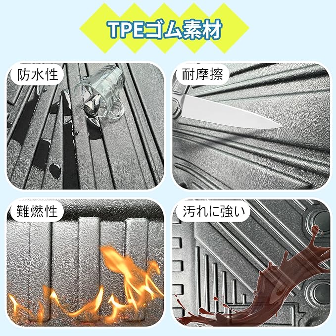 【防水・頑丈素材】: 水・汚れに強く、抗菌、落ち着いた高級感のあるTPEゴムフロアマット。裏面はすべり止め加工を施していますので、雨の日も雪の日も安心して運転できます。
