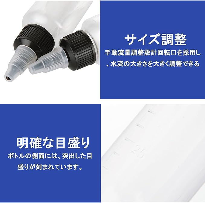 回転キャップ:回転キャップは滑りにくく、ねじ込むのが簡単です。密閉性が高く、液漏れがありません。吐出量もコントロールしやすい。