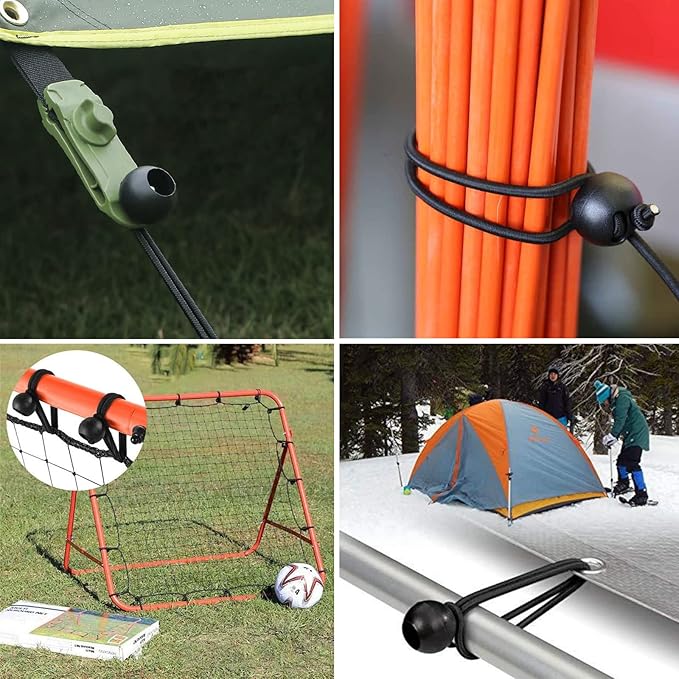 【使いやすさ】ボールバンジーは、伸縮性のあるループをタープグロメットに通すだけで、セットアップや取り外しが簡単な、素早く簡単なループです。バッグに入れて持ち運びが簡単で、何度でも再利用できます。