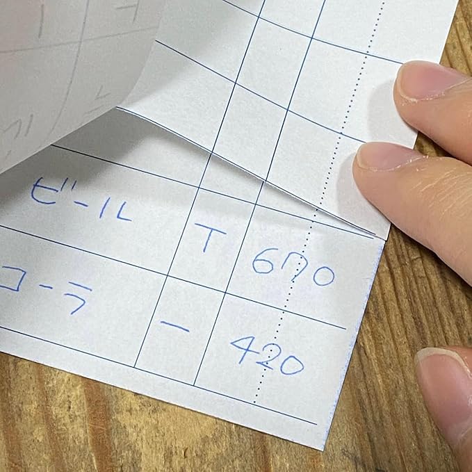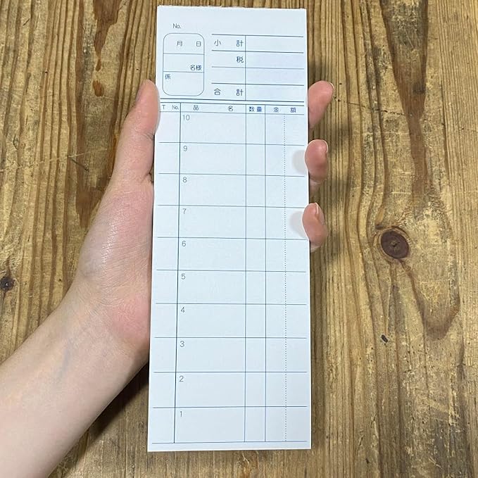 ■数量 :10冊■サイズ:7.5cm 21.5cm■タイプ:複写伝票(1冊あたり、50組で-のり付け製本)■紙:ノーカーボン紙(白)■刷色:ブルー■特徴:上の紙に切り取りミシン10本入ってます。□日付記入欄あり□Total合計金額項目記入欄あり□番号記入欄あり■居酒屋や焼き肉店など用