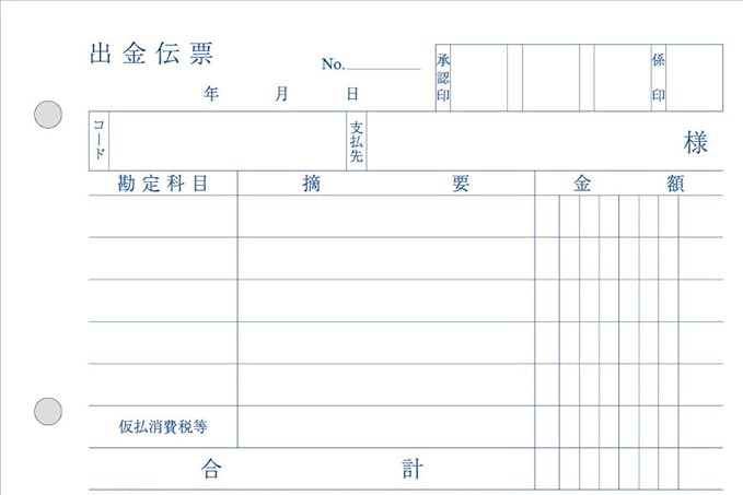 ●品名/出金伝票 ●サイズ/A6・ヨコ型 ●タテ・ヨコ/106・150 ●行数/6行 ●紙質/上質紙 ●枚数/100枚