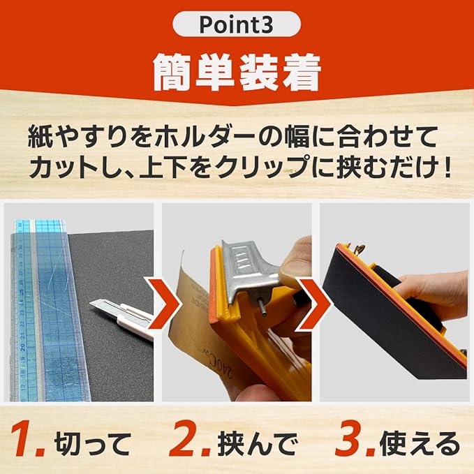【使い方簡単】かみやすりをホルダーの幅に合わせてカットし、上下を挟むだけで使えるクリップ式です。さらに、基本仕上げから鏡面仕上げまで可能な紙やすりが、15枚も付属したお得な木工やすりセットになっています。クロスの下地処理や木材材料の表面仕上げ、面取りなど、diyから仕事用までお使い頂ける簡単やすりです。