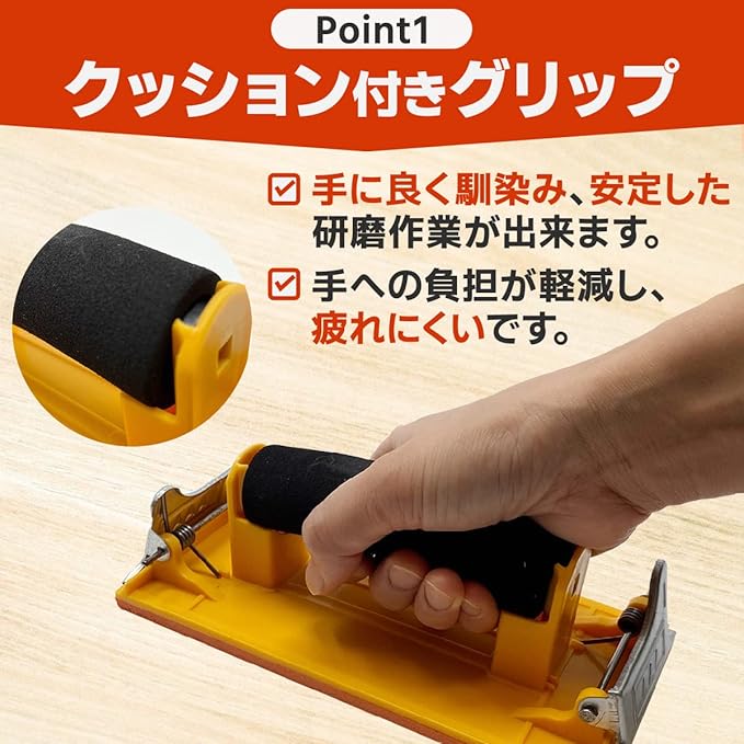 【手を保護しながら研磨】グリップ感が良く滑らかに研磨できます。余計な力が入らないので、力の入れ過ぎで起こる紙やすりの目詰まりが軽減し、長持ちします。又、持ち手にクッションがついており、手への負担が軽減。疲れにくく、長時間安定した研磨ができます。