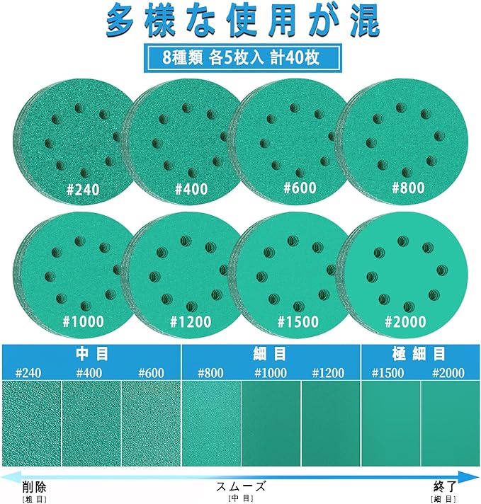 耐水サンドペーパー 125mm サンダー ペーパー 8穴 丸型 ディスクペーパー 41枚入セット(240/400/600/800/1000/1200/1500/2000 各5枚)サンダー用サンディングディスク ヘッドライトの研磨 木工DIY作業に 金属磨き | etshop