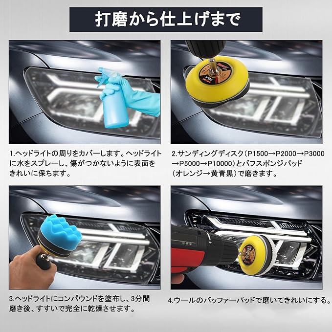 【多機能研磨セット】サンダーペーパーには、60~10000番手までの75mmサンドペーパー120枚(各番手10枚)、6枚の研磨パッド(2枚緩衝プレート付き)、2枚六角軸&1枚丸軸、スポンジサンディングブロック2個が含まれ、研磨~仕上げまでこれ1つで完了。