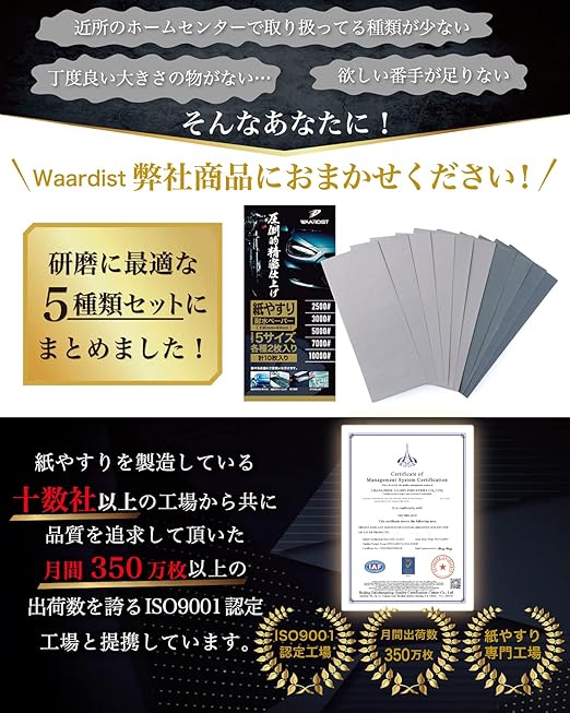 1000#2000#2500#3000#5000#縦230mm 横150mm 各サイズ10枚づつ計10枚入りの紙やすり 耐水ペーパー セットになります。 【こだわり】かみやすり サンドペーパーを製造している十数社の工場から品質、機能を共に追及して頂いたISO9001認定取得の紙ヤスリ工場と提携しております。 “研磨力”に重点を置き、素材には地球上で3番目に硬い化合物である炭化ケイ素を採用しました。 【専門家の監修】紙やすりを選ぶうえで欲しい番手が足りない、1枚のサイズが大きくて番手を揃えると費用がかさむ、いちいちサイズ調整をする手間がめんどくさい。 そんな声をお聞きし専門家監修の元、精密仕上げに最適な5種類を厳選し使い勝手の良いサイズ選定を致しました。 【使用用途】ヘッドライト、車&バイクのメンテナンス、水回りのクリーニング、包丁やナイフ等の刃物研ぎ、プラモデルの仕上げ、その他様々な用途でご利用頂ける紙ヤスリ 耐水ペーパーセットです。
