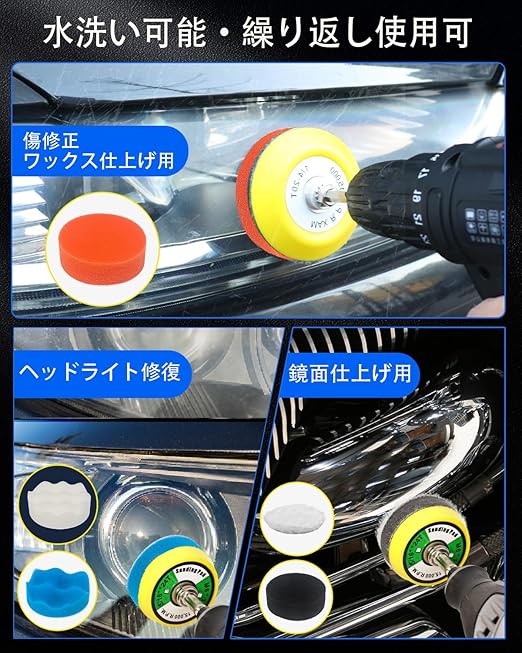洗浄可能・繰り返し使用可:洗浄して再利用できるので経済的です。研磨スポンジは4色の異なる硬度で(オレンジ>青>白>黒)、研磨→傷取り→下地調整→光沢仕上げと段階的に使用します。スポンジバフは研磨・傷除去・艶出しに最適。バフ ポリッシャー用の羊毛イミテーションパッドは、汚れ落とし・ワックスがけ・最終仕上げに特化しています