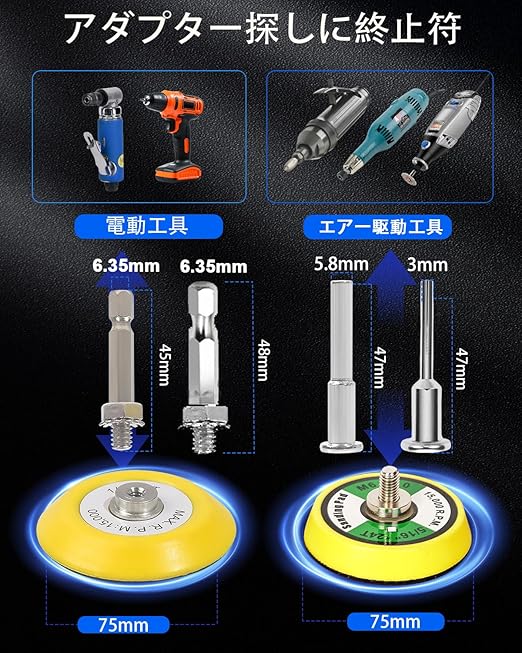 多機能ポリッシャー バフセット:この車用ポリッシャーキットは、75mm耐水ペーパー60-10000番を含み、乾湿両用で使用可能。オービタルサンダーパッド、スポンジバフ、バフポリッシャー、轴 4個(6.35mm 2本、6mm 1本、3mm 1本のシャンク付き)で、研磨から鏡面仕上げまでスムーズに移行可能