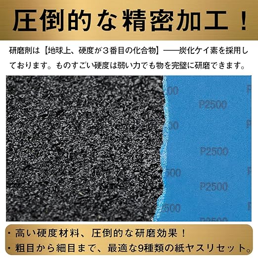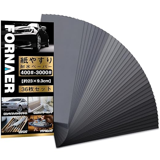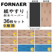 粗目から細目まで、9つの粒度 各4枚、全部で36枚が入っています。耐水ペーパーは約230 mm 93 mmです。粒度は#400、#600、#800、#1000、#1200、#1500、#2000、#2500、#3000となります。安くて上質で、ご使用に満足します。