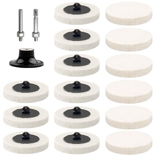 ポリッシャーバフセット内容:15枚 フェルト バフ、1個 ディスクブラケット、1個金属六角軸、1個 金属丸シャフト,フェルトバフはユニークな安全トルクネジがあり、ツールで簡単に取り外すことができます,
