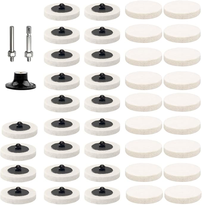 ポリッシャーバフセット: 40枚 フェルト バフ、1個 ディスクブラケット、1個金属六角軸、1個 金属丸シャフト,フェルトバフはユニークな安全トルクネジがあり、ツールで簡単に取り外すことができます