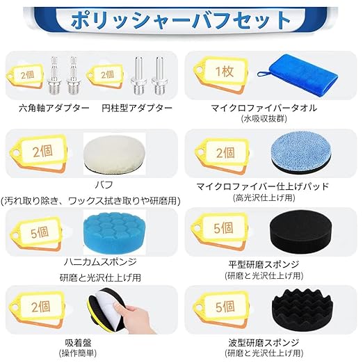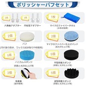 【電動ドリルポリッシャーセット内容】 ①吸着盤*2個 ②研磨スポンジバフ*15個 平面スポンジ、波形スポンジ、ハニカムス型ポンジずつ5個 直径80mm、厚み30mm③研磨パッド*2個 直径80mm、厚み20mm ④マイクロファイバーパッド*2個 直径80mm、厚み10mm⑤マイクロファイバータオル*1個 30*30cm⑥六角軸アダプター*2個⑦円柱型アダプター*2個 合わせて26点セットです。